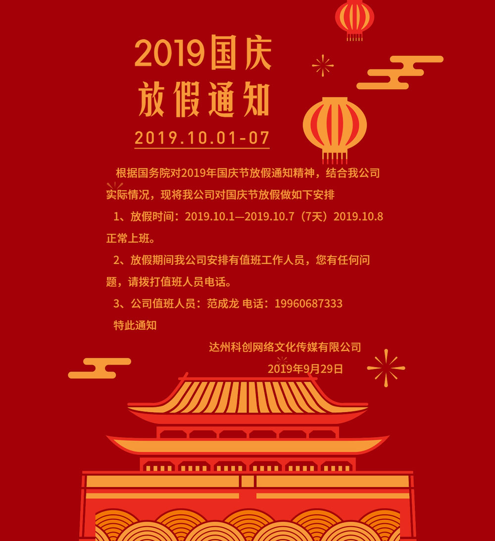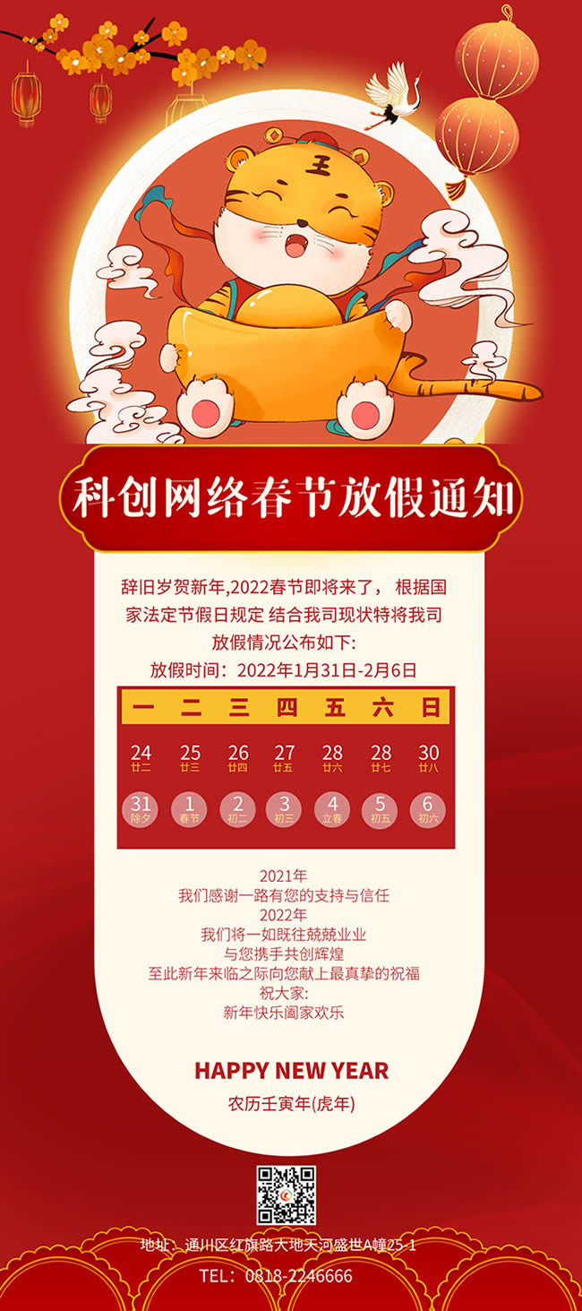 辭舊歲賀新年,2024春節(jié)即將來了, 根據(jù)國家法定節(jié)假日規(guī)定 結(jié)合我司現(xiàn)狀特將我司放假情況公布如下:放假時(shí)間: 2024年2月8日-2月18日至此新年來臨之際向您獻(xiàn)上最真摯的祝福 ...